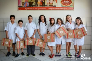 Alguns alunos foram sorteados para levar para casa a Maleta Literária, momento que se sentirão verdadeiros cientistas, usando seu jaleco personalizado e realizando experiências!