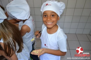 Antes de começarem as oficinas, as crianças lavaram as mãos e vestiram aventais e toucas de chefs de cozinha. O momento mais esperado foi quando eles, literalmente colocaram as mãos na massa.