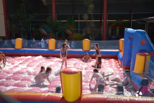 Na quadra da escola, diversos brinquedos infláveis faziam a alegria das crianças que num intervalo e outro, se deliciavam com pipoca, e algodão doce.