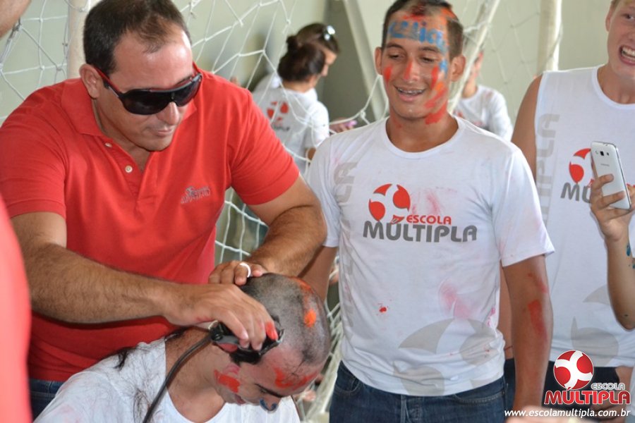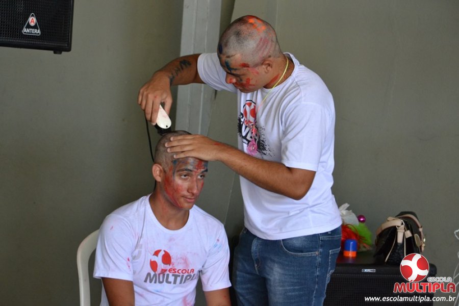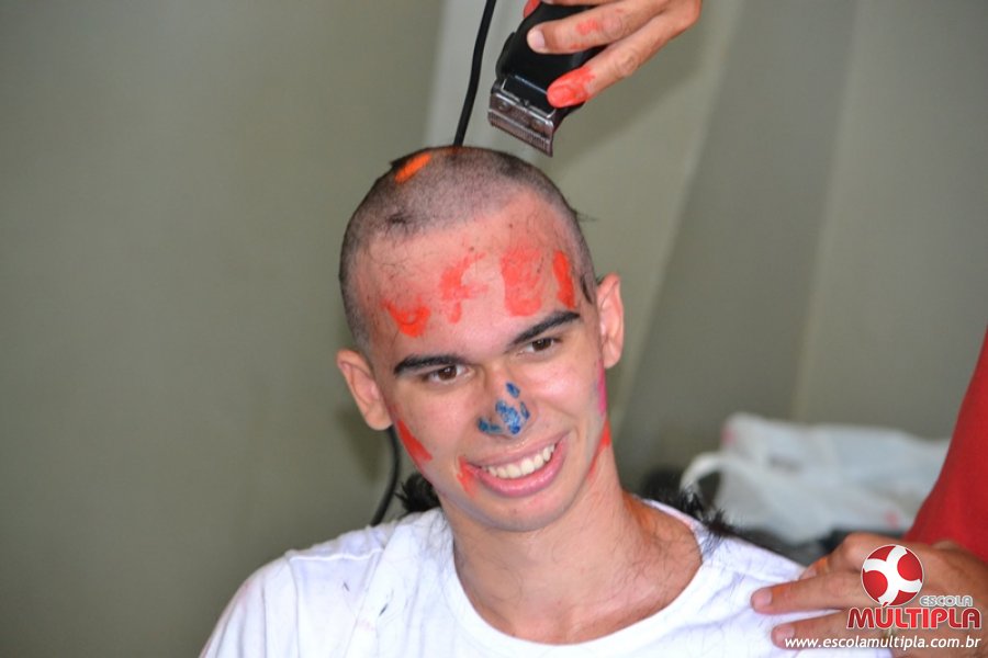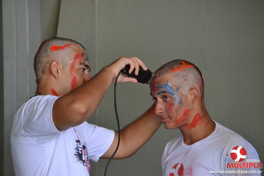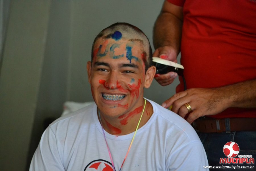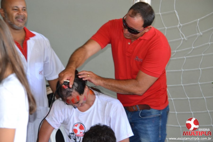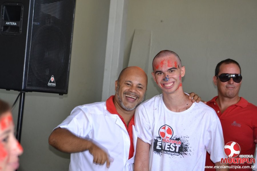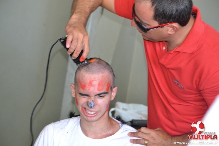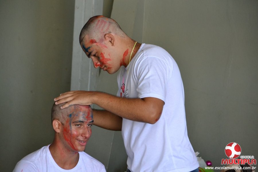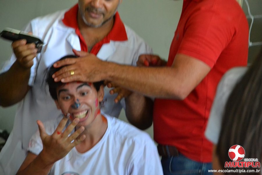 Para abrilhantar ainda mais o primeiro dia de aula, convidamos os alunos aprovados no Vest/2015 para falarem da experiência de conquistar o ingresso no Ensino Superior. Os coordenadores e professores aproveitaram para pregarem um “trote”, momento que rasparam o cabelo de alguns alunos e pintarem o rosto com tinta.