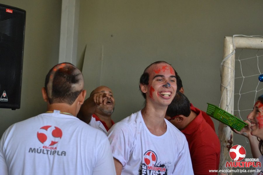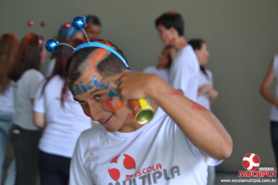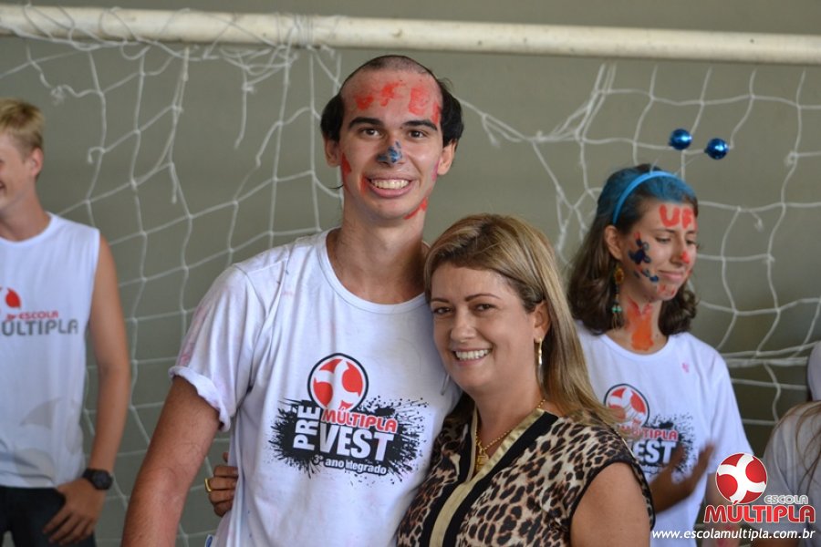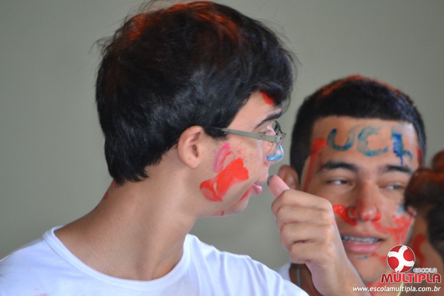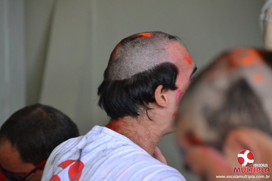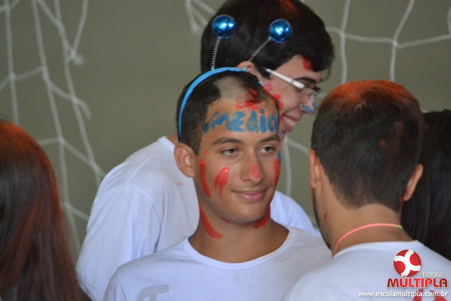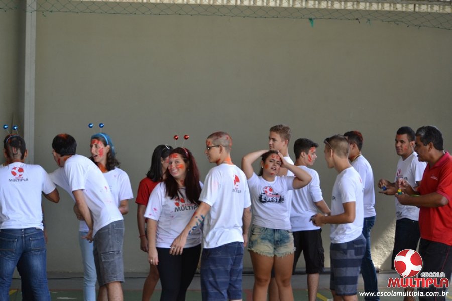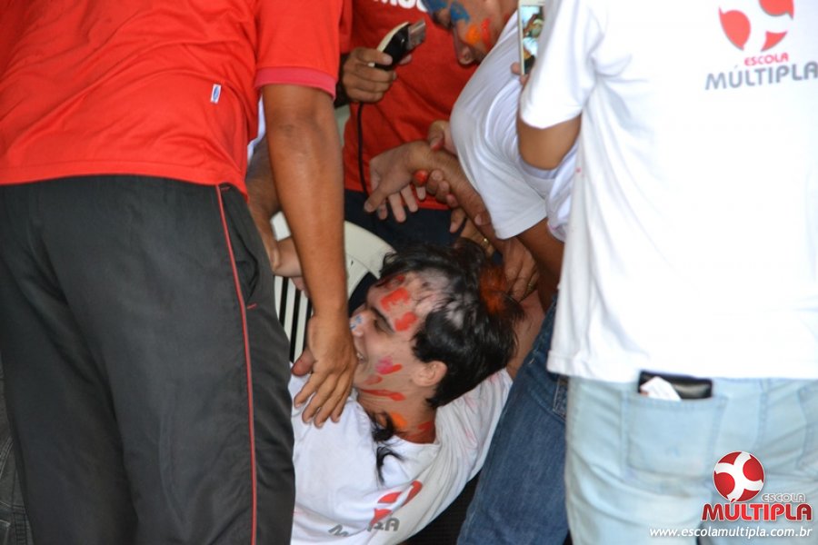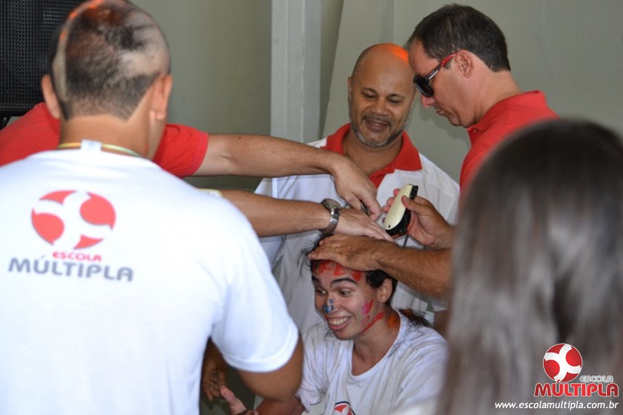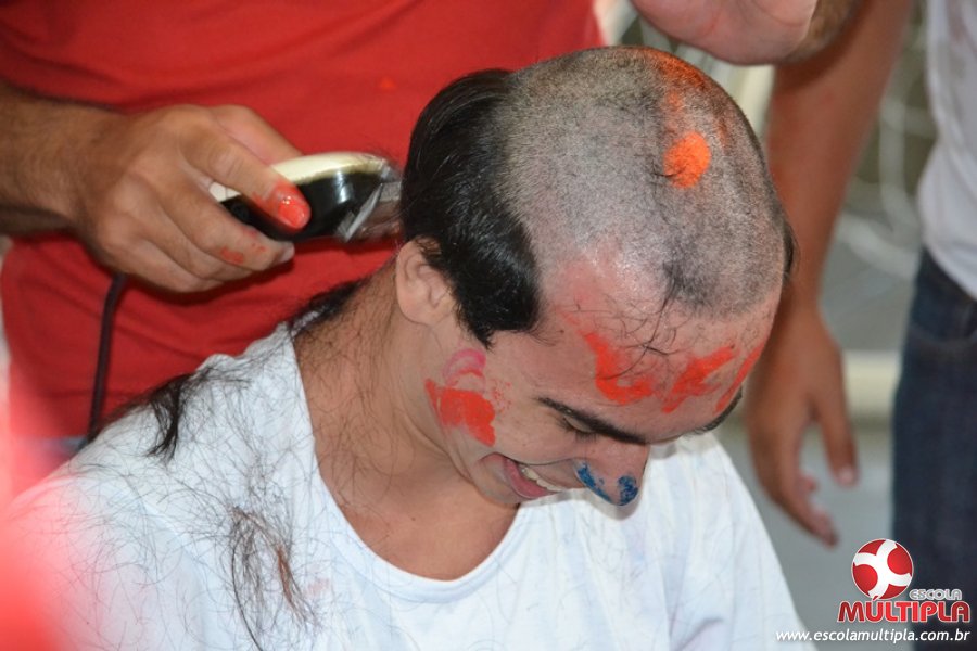 Para abrilhantar ainda mais o primeiro dia de aula, convidamos os alunos aprovados no Vest/2015 para falarem da experiência de conquistar o ingresso no Ensino Superior. Os coordenadores e professores aproveitaram para pregarem um “trote”, momento que rasparam o cabelo de alguns alunos e pintarem o rosto com tinta.