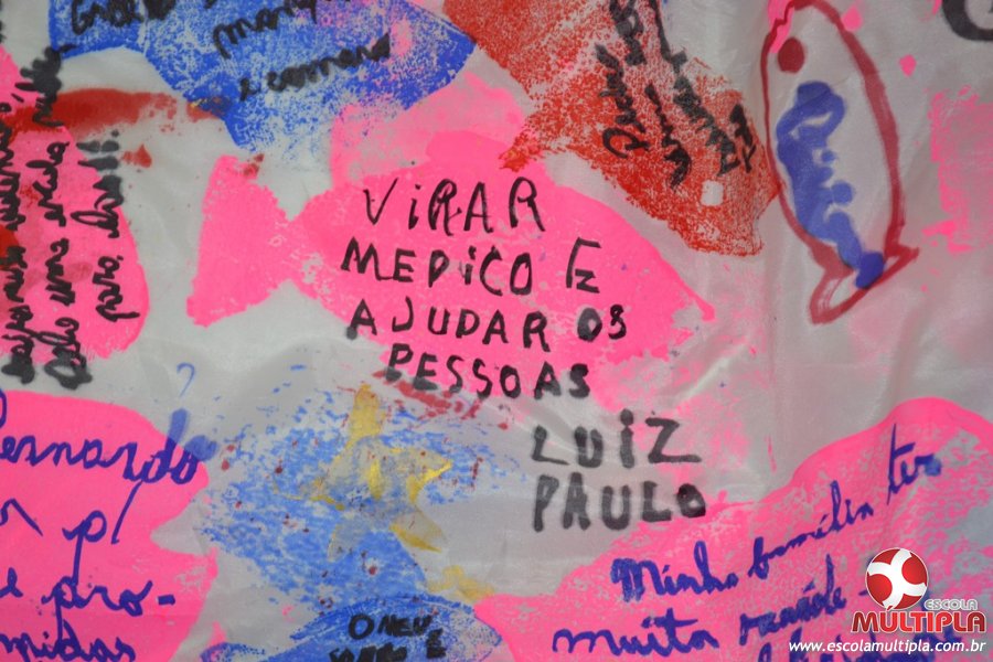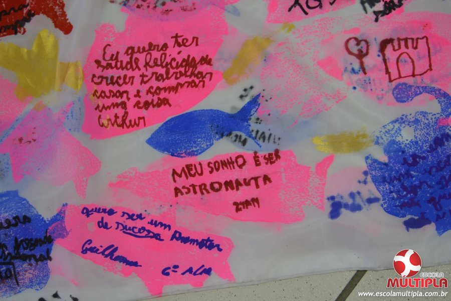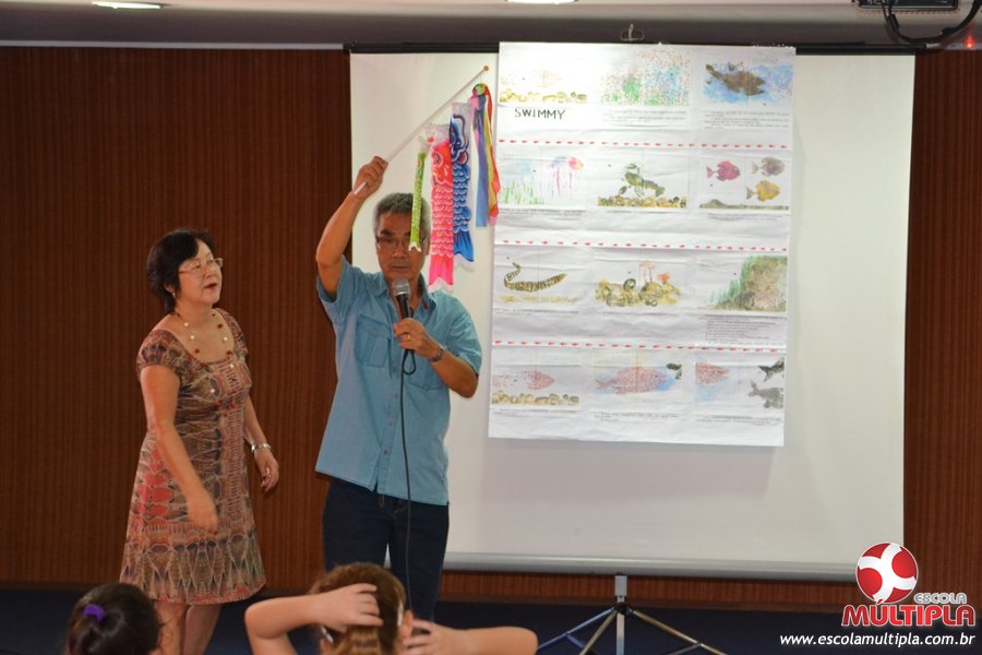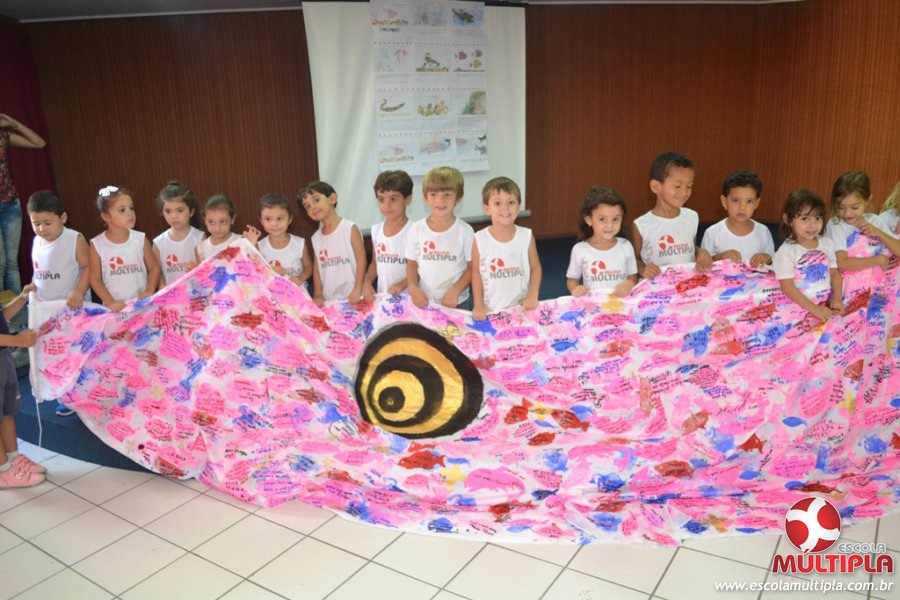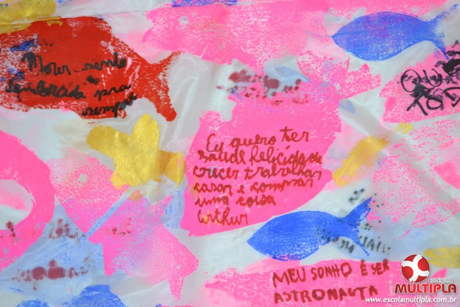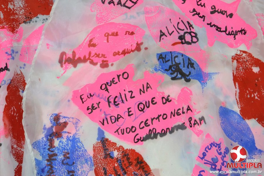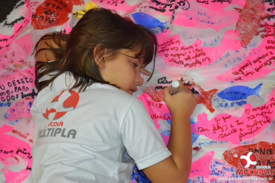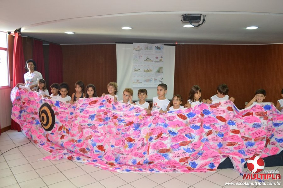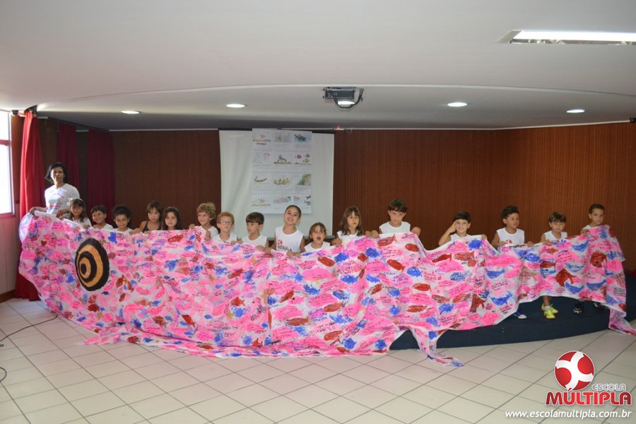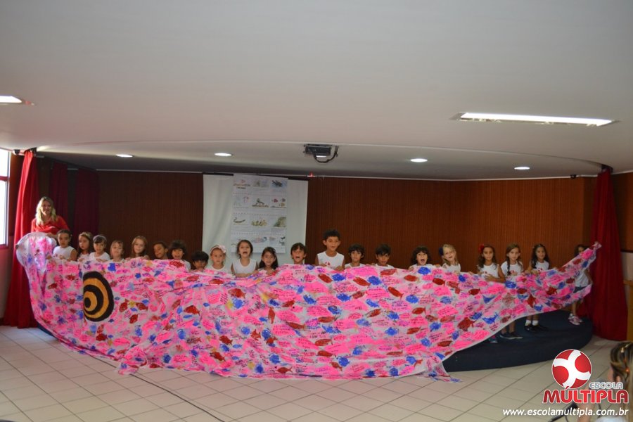 Após ouvirem a apresentação desta cultura japonesa e a história do Swimmy, os alunos da ED. Infantil e 1º anos fizeram seus pedidos e os alunos dos 2º aos 5º ANOS deixaram suas mensagens no peixe feito de mais de 10 metros de tecido.