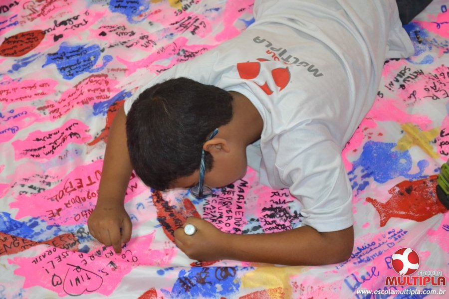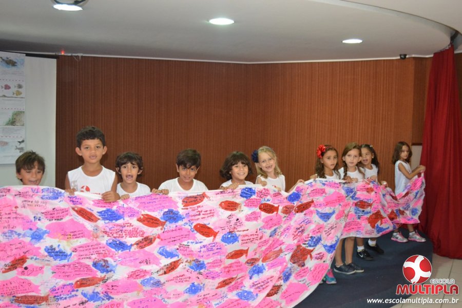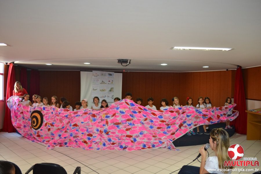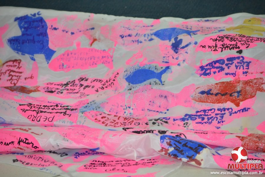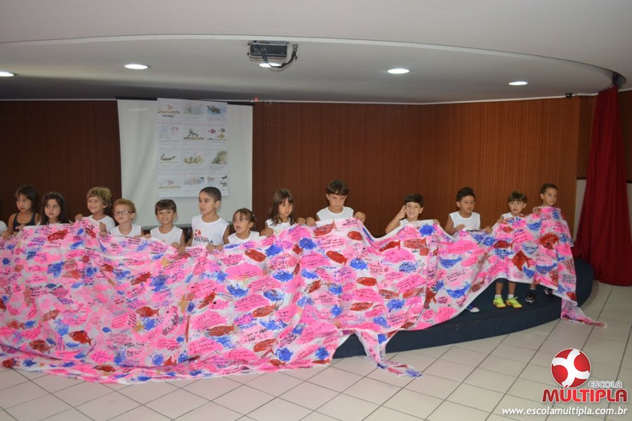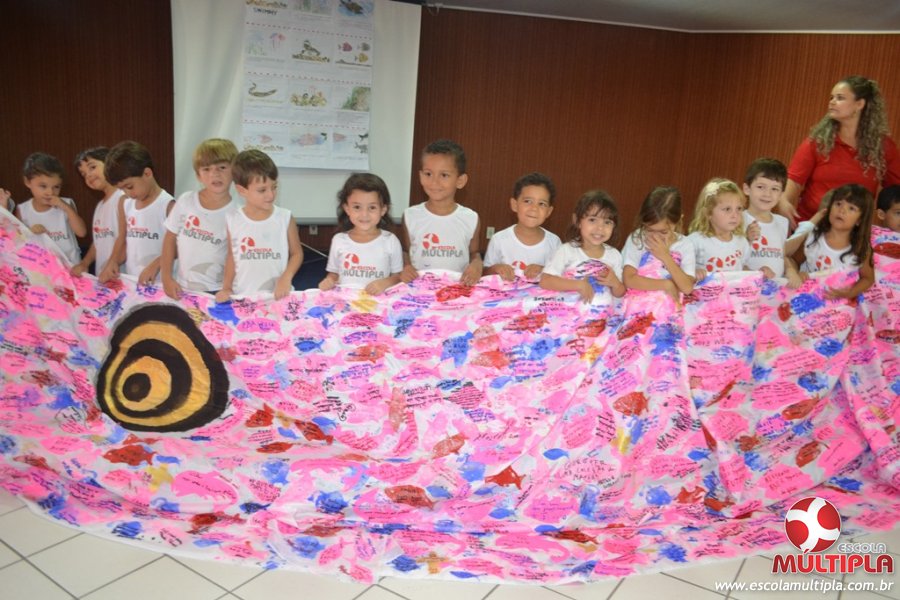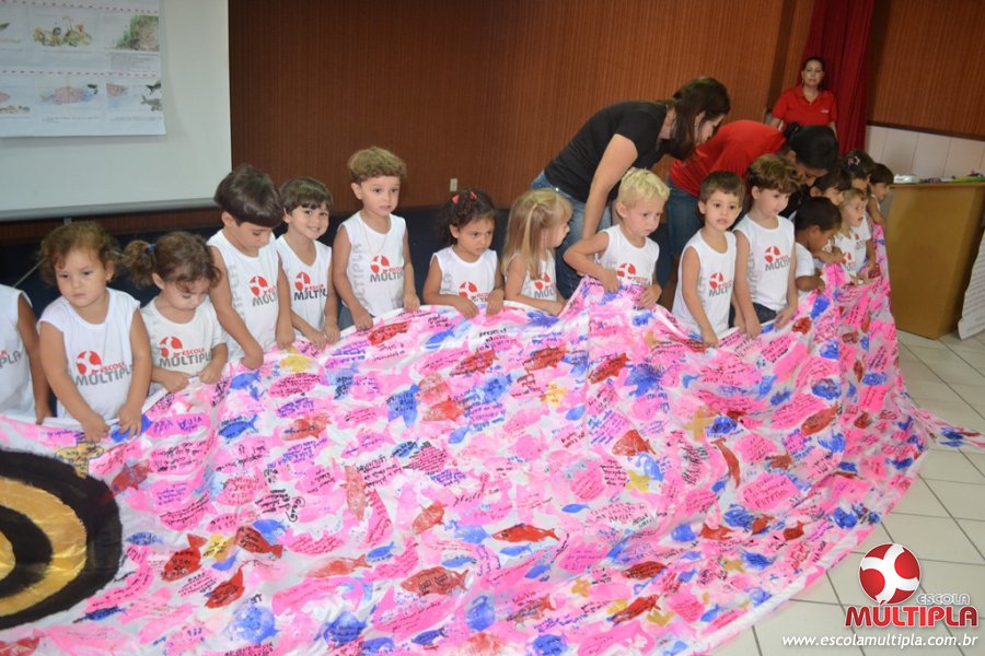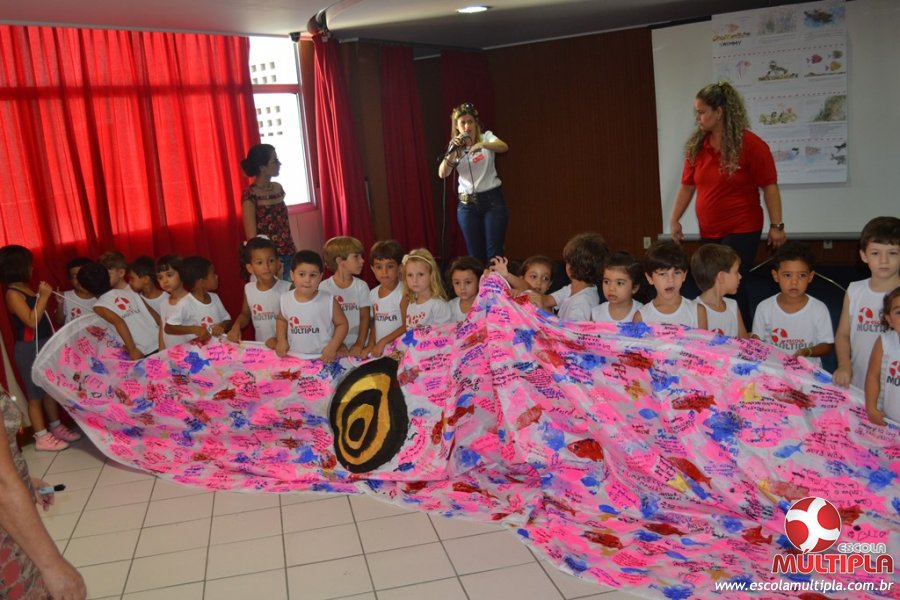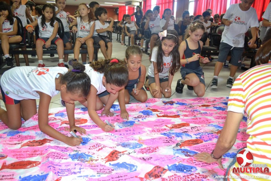 Após ouvirem a apresentação desta cultura japonesa e a história do Swimmy, os alunos da ED. Infantil e 1º anos fizeram seus pedidos e os alunos dos 2º aos 5º ANOS deixaram suas mensagens no peixe feito de mais de 10 metros de tecido.