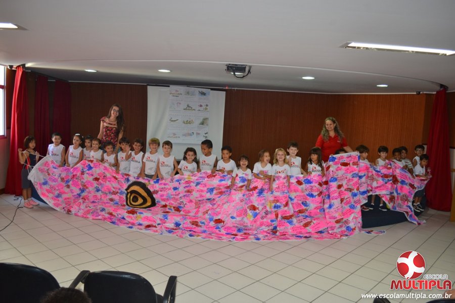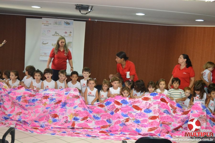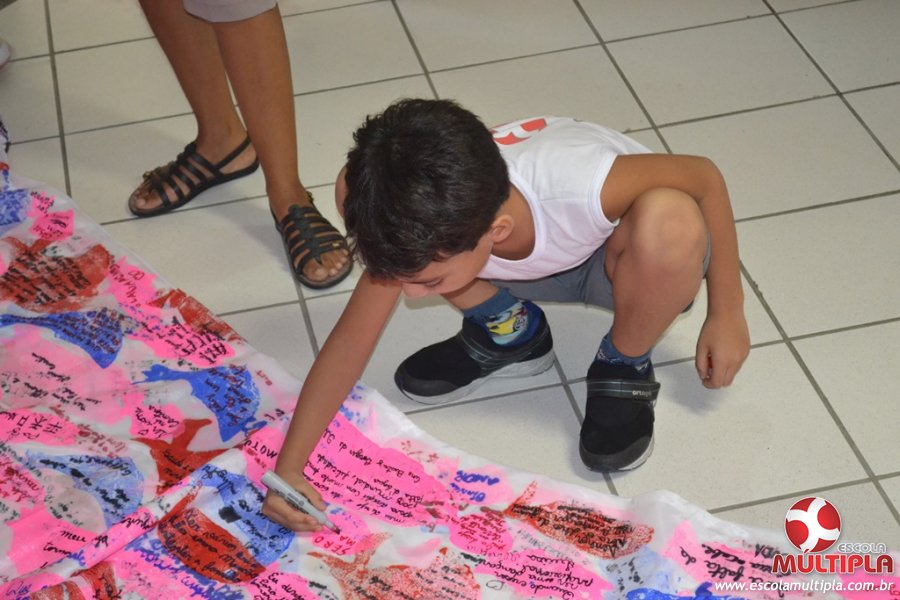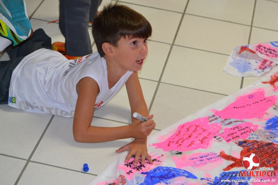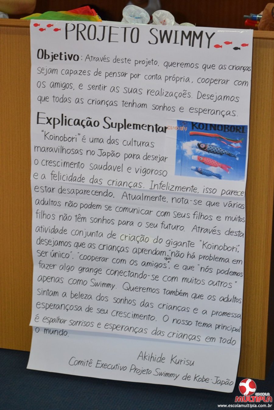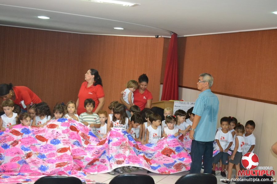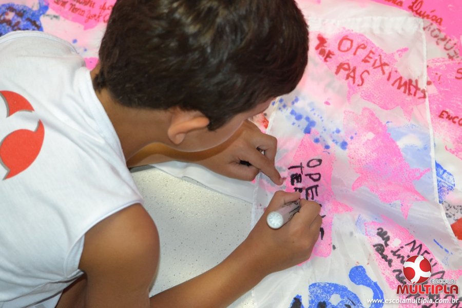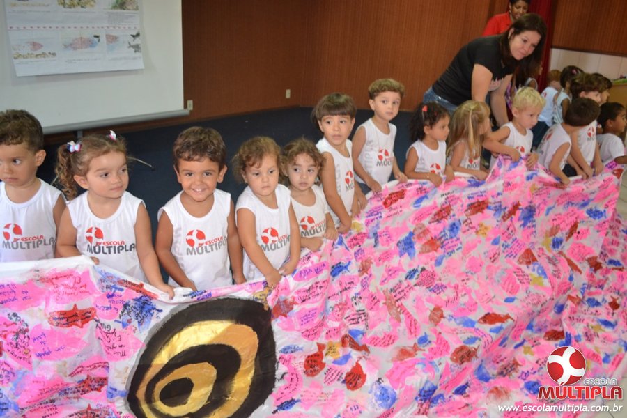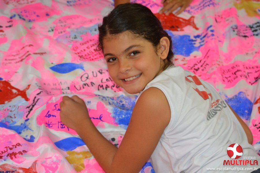 Após ouvirem a apresentação desta cultura japonesa e a história do Swimmy, os alunos da ED. Infantil e 1º anos fizeram seus pedidos e os alunos dos 2º aos 5º ANOS deixaram suas mensagens no peixe feito de mais de 10 metros de tecido.
