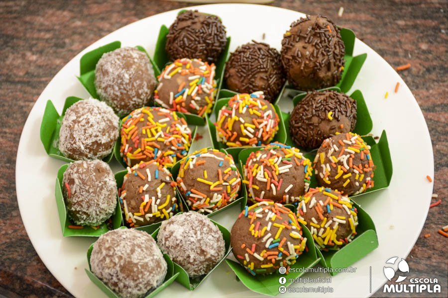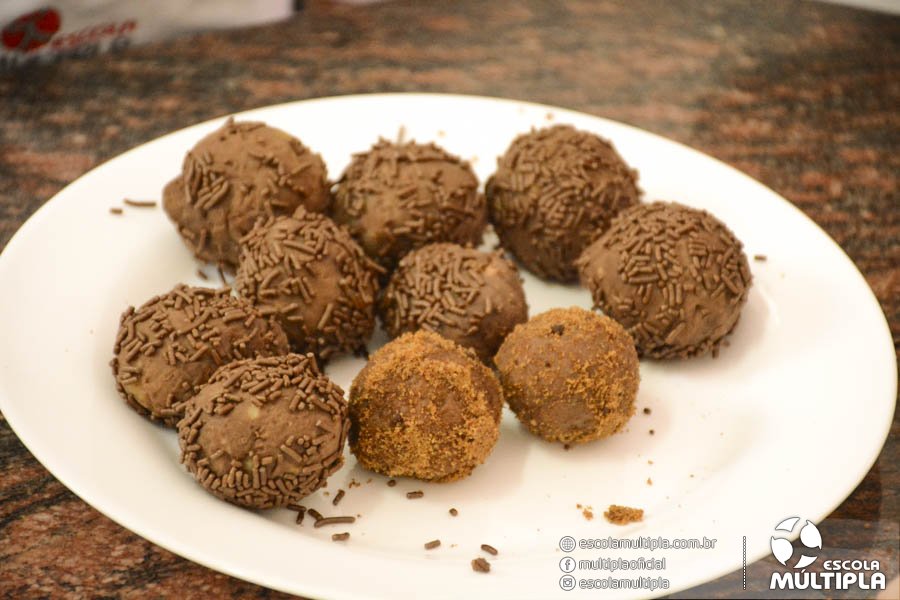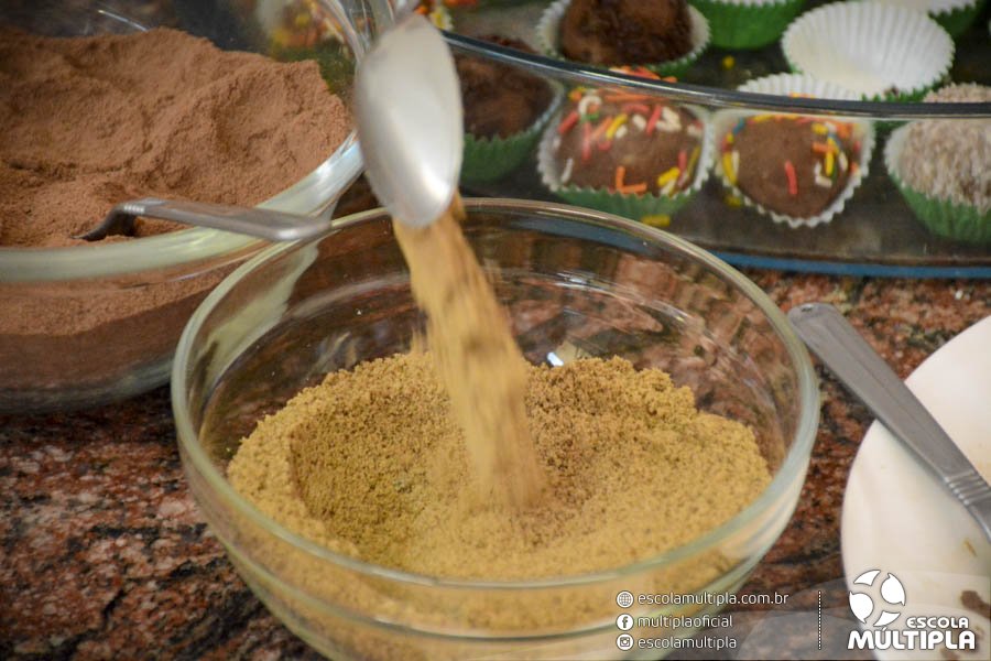 Adicione o açúcar, o cacau e a canela, e misture bem até ficar bem uniforme. Se preferir, adicione mais cacau e açúcar.Modele bolinhas do tamanho que preferir, passe nos confeitos e coloque nas forminhas.
