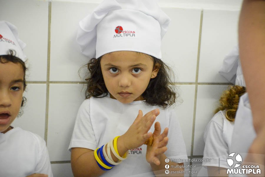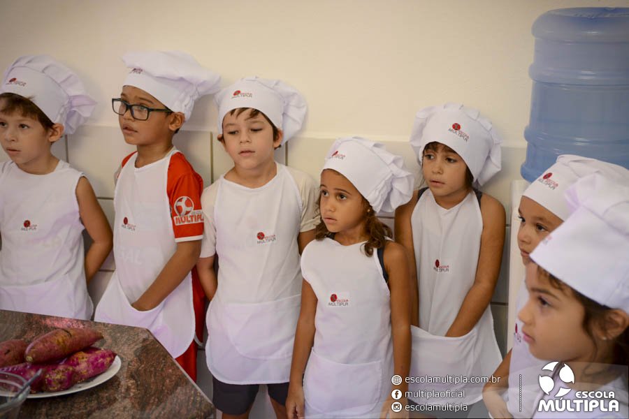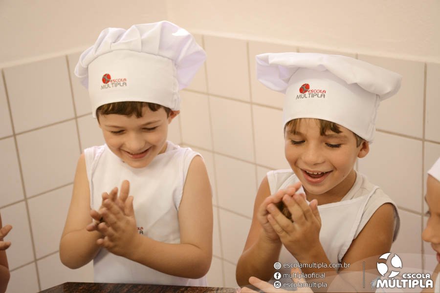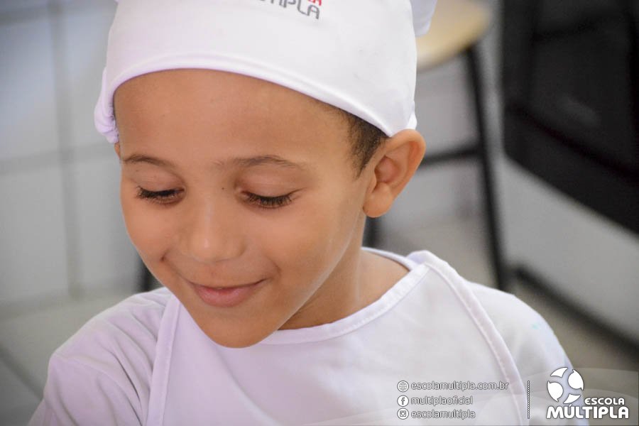 Os alunos aprenderam desde a importância da higiene, usando avental e touca de cozinheiro até colocarem literalmente as mãos na massa, fazendo as receitas.