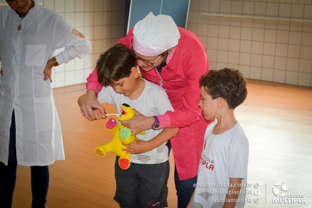 Após essa dinâmica, os alunos que trouxeram a sua escova de dente, puderam aprender na prática, como fazer uma higienização dentária.