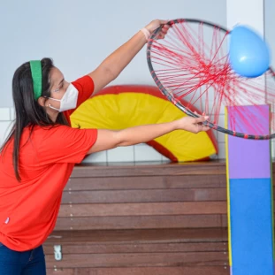 A atividade teve como objetivo de aprendizagem e desenvolvimento deslocar seu corpo no espaço, orientando-se por noções como frente, atrás, no alto, embaixo, dentro e fora, além do trabalho com as formas geométricas e psicomotricidade.