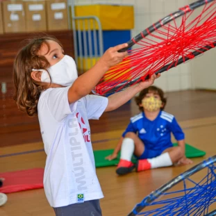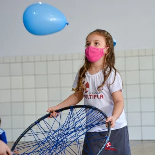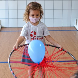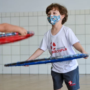 A partir da proposta do livro didático Explorar e Descobrir, a turminha do Infantil 3 junto com a professora, foram desafiados a criar com bambolês. O brinquedo escolhido para ser construído foi a raquete.