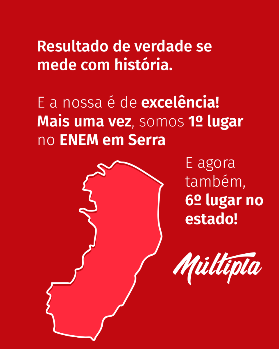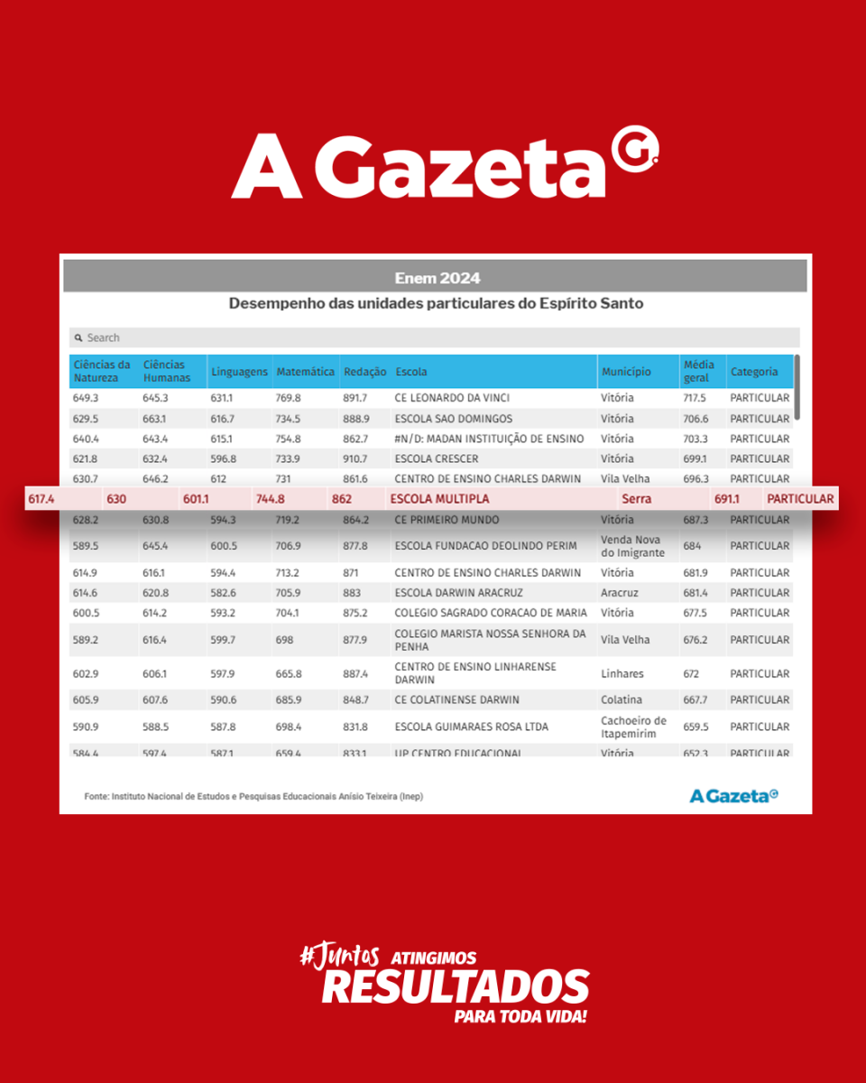 A Escola Múltipla acaba de alcançar o maior resultado de sua história no Exame Nacional do Ensino Médio (ENEM), edição 2024. Pela sétima vez consecutiva, reafirmamos nossa liderança como a escola com o melhor desempenho do município da Serra. Mas, neste ano, fomos além: alcançamos a 6ª colocação em todo o Espírito Santo e passamos a figurar entre as 150 maiores médias do Brasil, em um universo de mais de 20 mil escolas avaliadas em todo o território nacional. Esse resultado extraordinário é motivo de orgulho, mas, acima de tudo, é a prova concreta de que nossa missão de oferecer uma Base Forte para Toda Vida está sendo cumprida com excelência, consistência e amor pela educação.